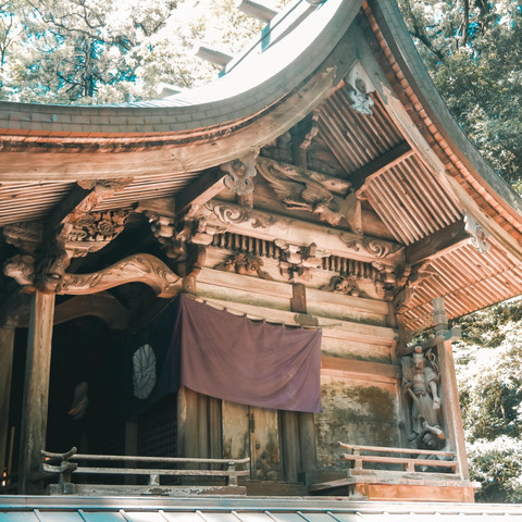 An ancient, unpainted Shinto shrine dedicated to 2 gods with a mouthful of names—Takachihosumegami and Jisshyadaimyoujin—the best deities to pray to for your marriage aspirations.